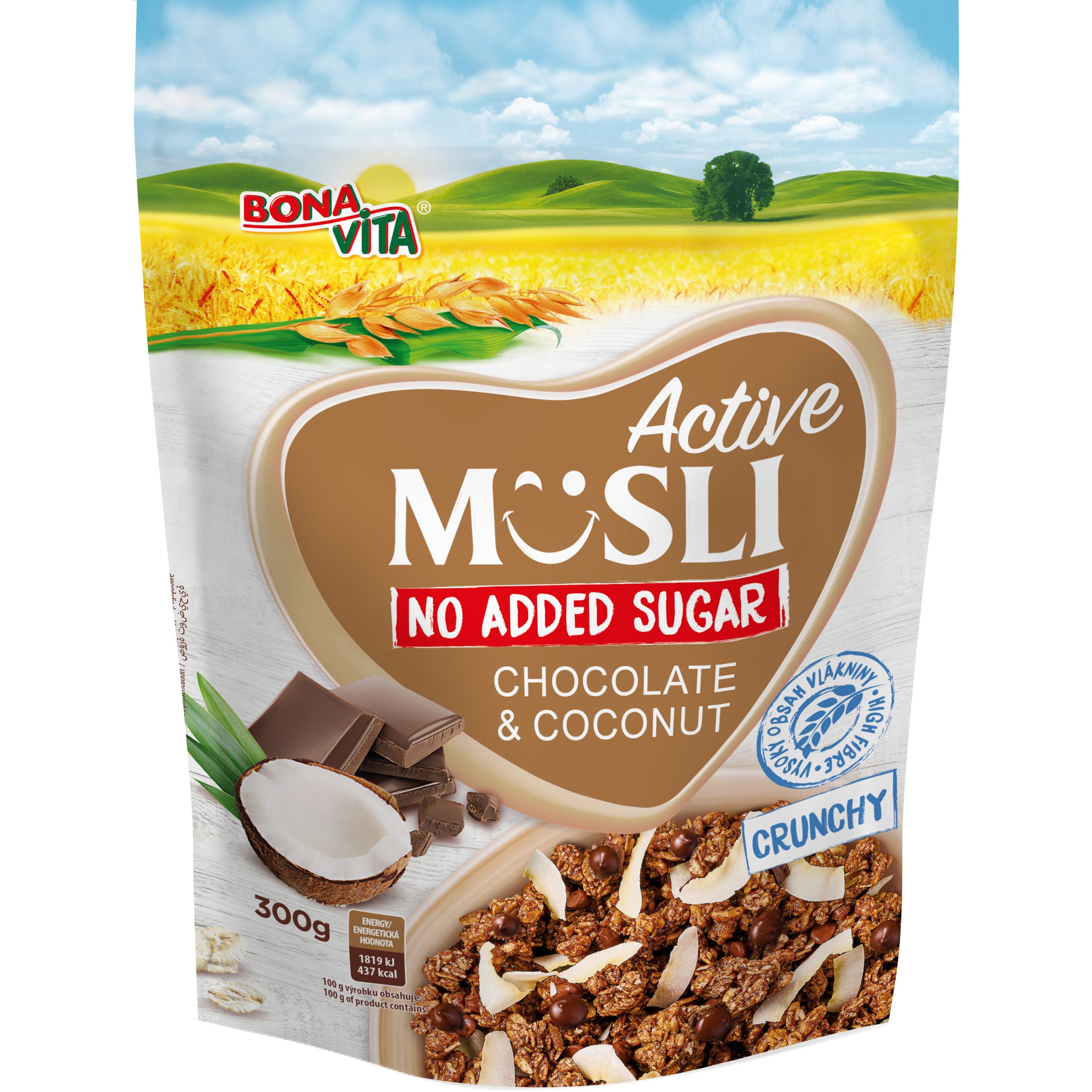 CRUNCHY MUSLI Z CZEKOLADĄ I KOKOSEM, BEZ DODATKU CUKRU.